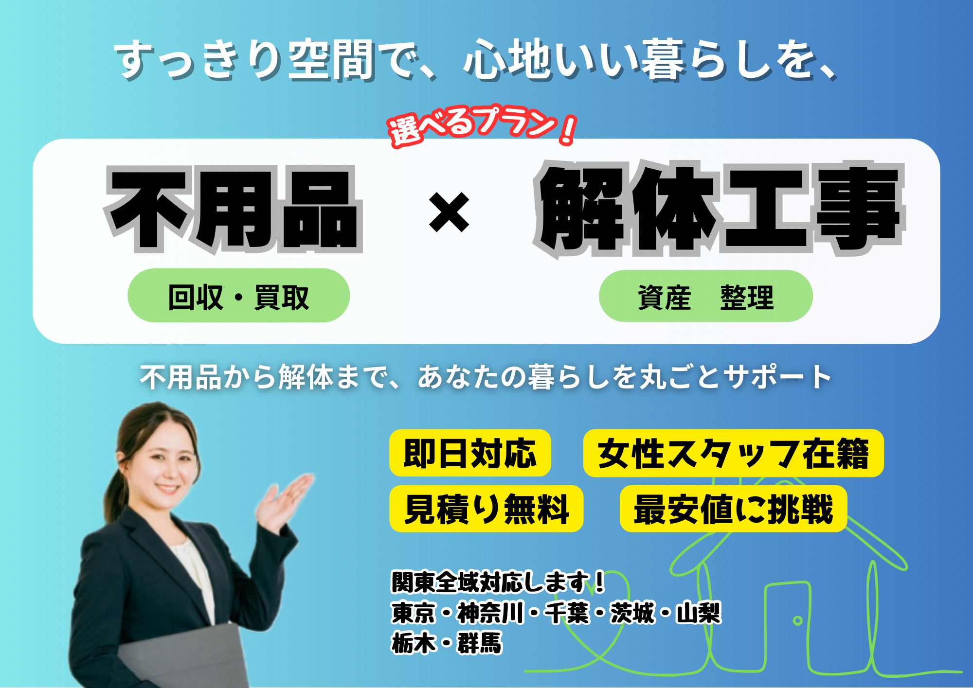 当社は、不用品買取・回収、リフォーム、解体、資産整理まで、住まいと暮らしのお悩みを “ワンストップ” で対応する会社です。